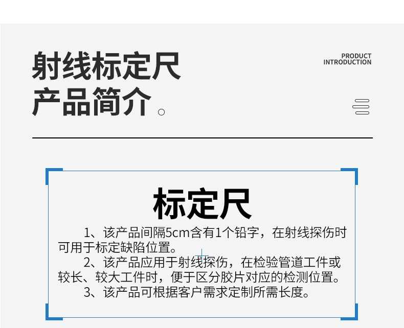 ·该产品应用于射线探伤,在检验管道工件或较长、较大工件时,便于区分胶片对应的检测位置。